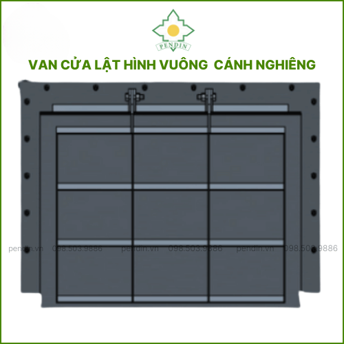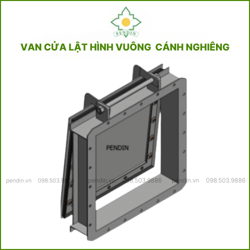 Van cửa lật vuông, cánh nghiêng góc là loại van có khung dạng hình vuông hoặc chữ nhật, với cánh van nghiêng một góc so với trục ngang. Thiết kế này giúp giảm trọng lượng của cánh, hỗ trợ quá trình mở van nhanh chóng với áp lực dòng chảy vừa phải.