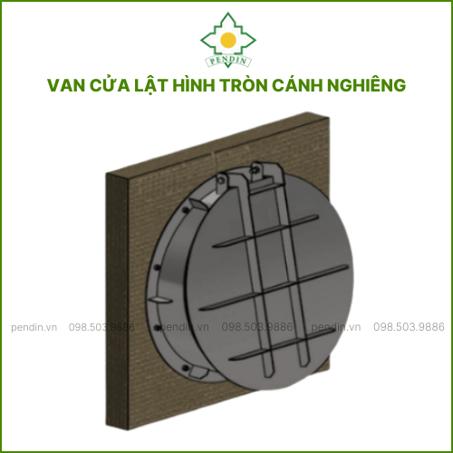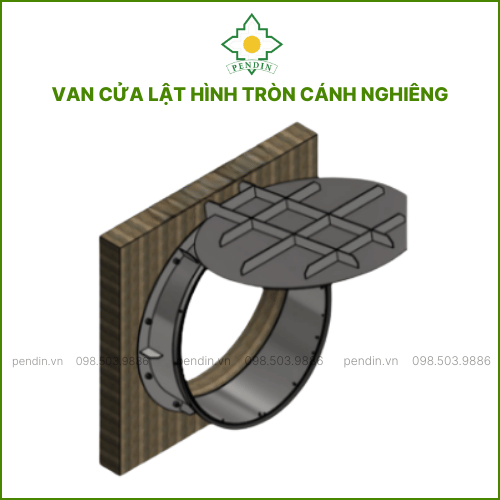 Van cửa lật tròn, cánh nghiêng góc là dòng van có mặt bích hình tròn và cánh van được thiết kế nghiêng một góc nhất định (thường 10–15 độ) so với phương ngang. Khi có dòng nước từ trong hệ thống đẩy ra, áp lực sẽ làm cánh van bật mở dễ dàng. Khi không còn áp lực, cánh van tự hạ xuống, đóng kín cửa xả.